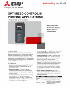 Enhance efficiency in water treatment and pumping systems with Mitsubishi Electric’s FR-F800-E Series variable frequency drives (VFDs). Equipped with advanced energy-saving technology, these drives help operators tackle common challenges like pump clogging, water hammer, and cavitation, ensuring reliable performance and long-term system protection.