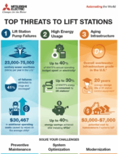 The primary causes of wastewater lift station failures include pump clogging, aging infrastructure, and inadequate monitoring. Mitsubishi Electric wastewater lift station solutions help mitigate these issues with built-in anti-clogging technology, predictive monitoring, and retrofit-ready designs that extend the life of pumps and ensure reliable operation.